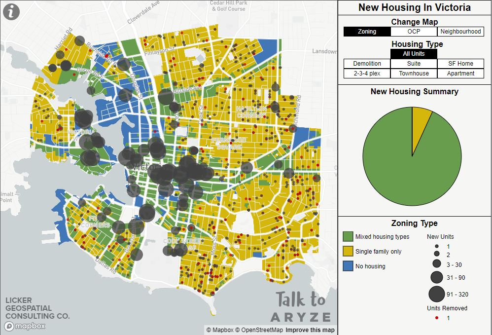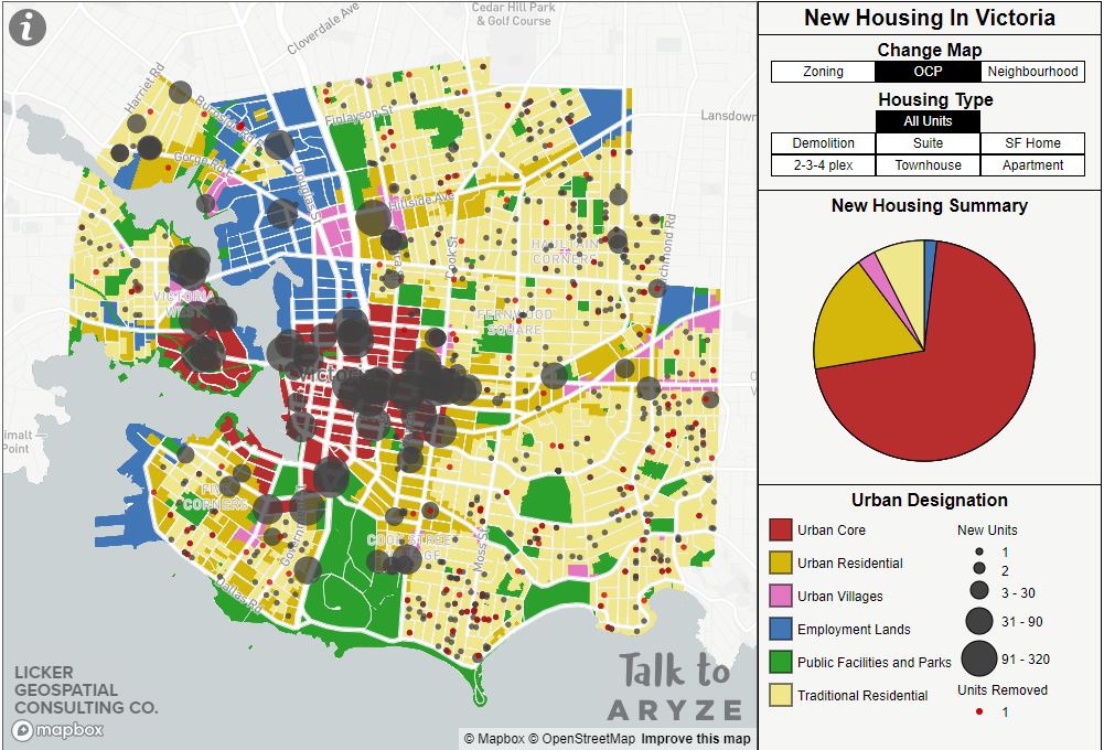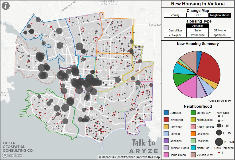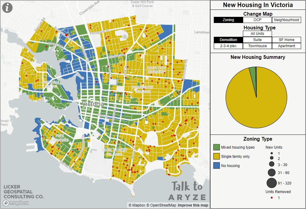 While it is true that the team here at LGeo is not tremendously fond of the word "insight", we do very much like conducting geospatial analysis and identifying potentially interesting data that creates conversations and confounds strongly held beliefs. To this end, we have been working with a development company in Victoria called Aryze Developments. Not your typical developer, Aryze is attempting to build housing in Victoria for the so-called "missing middle". That is to say, neither high-rise developments nor single family homes, but primarily townhouses and small apartment buildings. To further that aim, they seek to re-frame the conversation around low-rise development on their highly engaging Talk To Aryze website. As part of their efforts, they are trying add more information to the land use and development conversation in Victoria, BC, A LOT more. Happily we are here to help.